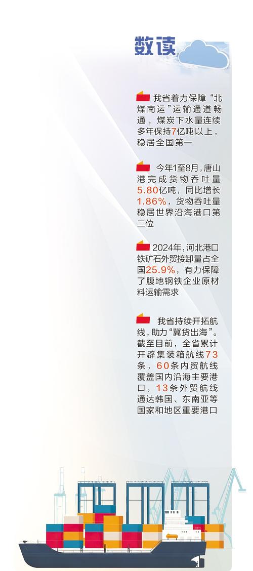 保障“北煤南运”运输通道畅通,煤炭下水量连续多年保持7亿吨以上,稳居全国第一;作为世界级大港,唐山港货物年吞吐量稳居世界沿海港口第二位;助力“冀货出海”,全省累计开辟73条集装箱航线,外贸航线通达韩国、东南亚等国家和地区重要港口……近年来,河北沿海港口活力澎湃,向海发展、向海图强新潮涌动。